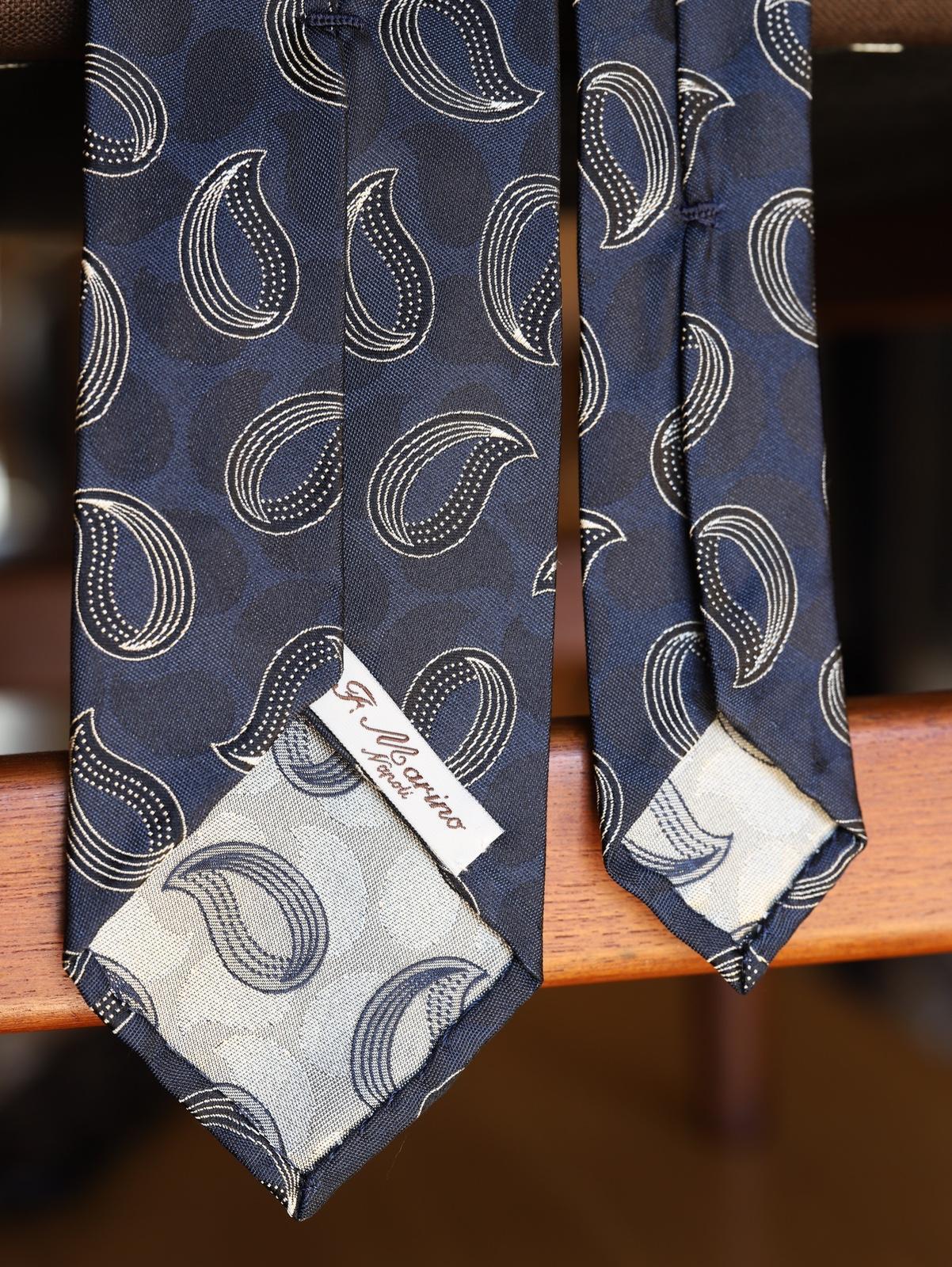 フランチェスコ マリーノ(Francesco Marino) SILK 100%MADE IN ITALY フランチェスコ マリーノはナポリ近郊の街でハンドメイドで仕立てられる、1928年創業の老舗ネクタイメーカーです。いわばナポリ製ネクタイの屋台骨ですね。手作り特有の柔らかい仕立て、絞め心地の良さ、緩み難い素材選び・芯使いが魅力的です。ダークグリーンベースにペイズリー。仕様はスフォデラート。よく見るとグリーン。絶妙の配色。シックな色合いで高級感が漂います。 大剣巾8.0cm 小剣巾4.5cm 長さ146cm
